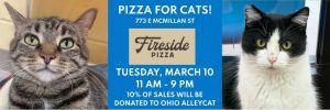 Place an order, in purr-son or carryout/delivery, from Fireside Pizza (773 E McMillan St in Walnut Hills) on Tuesday, March 10 from 11 AM – 9 PM and help Ohio Alleycat Resource & Spay/Neuter Clinic.